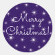 Pegatina de Navidad, cielo azul profundo de noche con estrellas brillantes. ¡Feliz Navidad! escrito en letra de moda escrita a mano.