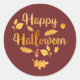 Estos pegatinas de la ronda muestran un mensaje de "Feliz Halloween" con ilustraciones de hojas de otoño y otoño y bellotas. Su forma redonda los hace perfectos para usarlos como sellos para sobres cuando envían tarjetas de Halloween.