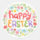 Feliz texto de Pascua con flores coloridas y hojas verdes formando un círculo sobre un fondo colorido, tema de vacaciones de primavera, colores vibrantes, diseño alegre.