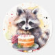 Pegatina Redonda Feliz Raccoon con pastel de cumpleaños