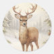 Pegatina Redonda Feliz reno navideño en un bosque nevado