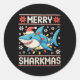 Pegatina Redonda Feliz Sharkmas Navidades de tiburón luces de Navid
