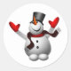 Un lindo muñeco de nieve feliz con los brazos estirados en mitones rojos y bufanda.