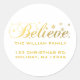 Navidades Holiday Gold Believe Pegatina de direcciones. Cree en los Navidades y en la paz, alegría y alegría que trae a los jóvenes y a los adultos, por igual. la palabra "crea" en el texto de escritura dorada diseño superpuesto con copos de nieve dorados cayendo sobre un fondo blanco de nieve. pegatina de impresión de alta calidad, color completo y sangre completa. Delante resistente a las escotillas, fácil y fácil Pegatina de dirección trasera de palo y pelado diseñado por nadil2 e impreso por Zazzle Paper.
