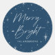 Modernos pegatinas de vacaciones con "Merry and Bright" mostrado en un guión con letras a mano rodeado por un borde de estrellas blancas contra un fondo marino. Personalice a los alegres y brillantes pegatinas añadiendo su apellido a continuación. ¡Los pegatinas trabajan muy bien como sellos para sobres, para sellar los bolsos de favores y más!
