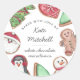 Personalice a estos lindos pegatinas con su nombre y tipo de galleta para etiquetar sus productos horneados de vacaciones. El diseño presenta ilustraciones de galletas acuáticas en formas vacacionales, incluyendo Santa, ornamentos, pingüino, muñeco de nieve y árbol de Navidad. Incluye tres campos de texto personalizado; se muestra con "horneado de amor por", su nombre y tipo de cookie.