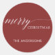 Pegatina rojo de vacaciones modernas con las palabras "Feliz Navidad". Personalizó esto agregando su propio texto.