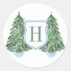 Pinos estilizados / Árboles de Navidad en plantadores azules y blancos. Delante hay una forma de insignia / escudo que contiene una sola inicial (puede ser del apellido o del nombre). Los elementos de acuarela fueron pintados a mano por mí antes de ser escaneados en forma digital (la forma del escudo es de otro artista).