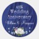 La rosa blanca naturalmente hermosa en plena floración combinada con campanillas y pequeños claveles sobre un fondo drapeado de azul profundo emana vibraciones de celebración de amor para esta pegatina de fiesta de aniversario de bodas de 65 años. El año y los nombres pueden personalizarse utilizando la plantilla proporcionada. Fotografía y diseño original de Anura Design Studio.
