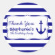 Patrón de franjas navales y fiesta de cumpleaños de ancla náutica gracias pegatinas. El diseño presenta un patrón a rayas marinas y blancas, una forma blanca en el centro con un ancla azul marino y un texto personalizado.