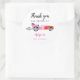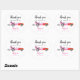 Partida de cumpleaños con el tema de los autos de carrera estilizados, favorece al pegatina con el ilustracion de un coche de época rosa con llama roja. El texto dice "gracias por las carreras".