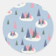Este diseño de aspecto vintage será perfecto en sus paquetes o como etiquetas de sobres para sellar su correspondencia escrita. Los árboles modernos sobre un montículo nevado parecen modernos pero retro...un ambiente moderno de mediados de siglo. Los árboles son rosas, azules y verdes con un fondo azul sereno. Elementos de coordinación disponibles en mi tienda.
