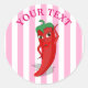 Un personaje de dibujos animados de pimiento rojo y picante. Diseño original con texto y fondo rosa.