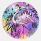 Flamenco pimpeado con bandana, tatuajes y bling. Fondo de grafiti con palmeras, una divertida pegatina para fiestas, despedidas de soltera o despedidas de soltero.
