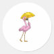 Pegatina Redonda Flamingo en la lluvia con paraguas