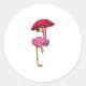 Pegatina Redonda Flamingo en la lluvia con paraguas