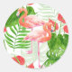 Diseño acuático con flores y pájaros flamencos, monstera y hojas de palma.