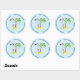Pegatinas de cocina con un lindo ilustracion de un flamingo rosa usando un sombrero rojo de santa. Sobre un montículo de arena con una palmera tropical detrás. Fondo azul claro. Personaliza con un nombre.
