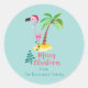 Pegatina navideña personalizada con un lindo ilustracion de un flamingo rosado en un sombrero rojo de santa. Junto a una palmera verde sobre un montón de arena amarilla. Se coloca un diseño de flamante árbol de navidad junto al texto Feliz Navidad. Escrito en el color rosa en un lujoso tipo de letra manuscrita. Fondo verde pastel. Personalice con un nombre, por ejemplo: De la familia Davenport.