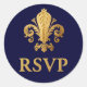 Fleur-de-lis RSVP. Oro en azul oscuro. Se puede cambiar el color de fondo. La mayoría de las imágenes de la serie de "hojas de oro" tienen un amplio área de fondo, por lo que, si está personalizando con texto o imagen, puede ajustar el marco (recorte) para que se adapte a muchas ideas.