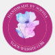 Personalice este pegatina de flor de color rosa y púrpura "Handmade By Name" con su nombre y sitio web sobre fondo de fucsia profunda en un diseño de círculo con texto blanco.