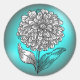 Flor delgada llena de pétalos sobre un tallo con dos hojas con fondo acuático y verde azulado