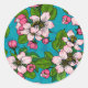 Flores de manzana dibujadas a mano y abejas con un fondo turquesa
