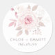 La preciosa rosa rosa rosa rosa rubí está rodeada de suaves hojas y bayas pastel. Un contorno rosa abierto agrega un toque de moda. Las bayas rosas profundas añaden un toque de color. Los nombres de las novias y novios siguen una letra moderna y minimalista. La fecha de boda de la pareja boda sigue en un elegante letra cursiva. Este pegatina coordina con