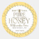 PURE HONEY escrito en lujoso texto de oro. Abeja de oro. Combo de miel de oro Grabado en relieve en un borde amarillo brillante. Su nombre de apiario está escrito en un tipo de letra legible.