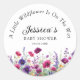 Un pegatina redondo clásico, lindo, con nombre y fecha, con un toque especial para el cliente, lindo, florido silvestre, rosa púrpura y una ducha de bebé. Solo edita tu producto en unos minutos. Puede cambiar el tipo de letra/tamaño/color y la posición utilizando "personalización adicional".