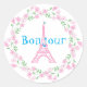 Cuenta con flores rosa bonito y el dicho "Bonjour" (Hola) en francés. El texto se puede personalizar. ¡Ideal para sellar sobres o bolsas de favoritas de partido! Las invitaciones, placas de papel y servilletas coincidentes están disponibles en mi tienda. Diseño ©2019 Rosalind Moore, Diseños de las vías de cerezo.