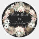Floral Black Rubor White Rustic Palm Foliage Bridal Shower Classic Round Pegatina para sellos para sobres, bolsas de regalo u otra decoración de ducha de novia. El fondo negro oscuro, rico en ébano, contrasta y resalta la delicada y acuarela obra de arte de las cremosas orquídeas blancas, el follaje de palma khaki tan, las hojas tropicales secas al estilo boho y la cortina de vegetación de helechos de salvia muda. Copyright, Audrey Jeanne Roberts.
