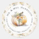 Etiqueta de dirección de devolución de acuarela pintada a mano con flores de otoño y una calabaza blanca, hojas de otoño y flores silvestres, Pegatina Redonda Clásica. Etiqueta de dirección de devolución elegante que puede duplicarse como sello de sobre añadiendo un toque final elegante a la presentación de su invitación. Tipografía de letra manuscrita junto con el nombre, dirección y monograma del remitente sobre un marco circular redondo simple moderno. Colores cálidos de otoño de naranja quemada, terracota, marrón, verde apagado y marfil. msp0113