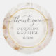 "Floral Modern Geometric Gold Purpurina Gracias Pegatina Redondo Clásico". Elegante guión caligrafía, mensaje de "gracias" para ducha boda o novia favorece a pegatinas y focas, tipografía de escritura junto con los nombres de la pareja y fecha boda sobre un moderno marco de estilo de velum redondo geométrico y purpurina dorado sobre un romántico fondo floral de orquídea rosa apenas rosa. Diseñado de forma gráfica por la artista y diseñadora con licencia internacional Audrey Jeanne Roberts, copyright.