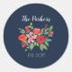 Añade un toque especial a tus sobres o favores de fiesta con este pegatina floral personalizado con flores rojas sobre un fondo azul marino.