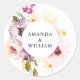 Agregue un toque especial a su boda con esta elegante etiqueta personalizada que presenta los nombres de la pareja en una fuente elegante. Decorada con delicadas flores de acuarela en tonos pastel suaves, es perfecta para sellar sobres, cajas de favores o decorar papelería de boda. Una hermosa manera de agregar un detalle romántico y personalizado a su gran día.