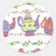 Tres macetas de té brillantes en un arcoiris de colores acentuados con filas de flores y flores.