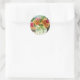 Bonito ramo de flores de color rojo, naranja y amarillo colocado en un jarrón de cristal sentado sobre una mesa junto a la ventana. Una escena boscosa por la ventana es el telón de fondo para esta relajante imagen. De una acuarela original de la artista Katherine Foltuz.