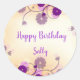 Feliz cumpleaños, flores púrpuras con un diseño de fondo marrón.