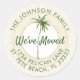 Nuestro pegatina/sello para sobres de dirección de retorno de invitación en movimiento cuenta con una palmera frente a un sol dorado sobre un fondo blanco y fresco. El nombre y la dirección están curvados alrededor del interior del gráfico solar, con las palabras "Nos hemos mudado" en el centro del pegatina. Este pegatina se coordina con un cambio de dirección postal y tarjeta plana con sobre.