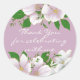 Añade un toque de elegancia a tu boda o a tus favores de ducha de novias con estos hermosos pegatinas redondos. ¡Un dulce agradecimiento por los detalles para toda tu familia y amigos que te aman tanto y que celebraron contigo en tu evento especial! Personaliza el masaje y lo hace específico y especial para ellos. Un suave fondo rosa para un toque de circunferencia y también para el contraste. Estos pegatinas le dan un toque de acabado elegante y sincero. Personalícelas para un detalle boda único que gustará a los huéspedes. El diseño presenta una gama de flores rosas suaves y botánicos verdes, todo delineado con una delgada línea dorada y rodeando el mensaje de agradecimiento. Es un detalle elegante y onírico.