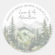 Wrapped along the top edge, the bride’s name and event date follow the curve of the sticker for a clean and balanced layout. At the bottom, a soft watercolor scene of pine trees, a winding path, and distant mountains adds a serene, nature-inspired touch.