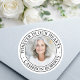 Round sticker featuring a photo and custom text "forever in our hearts" and name in an elegant serif font on a white background.