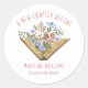 Precioso libro abierto con flores y la frase Un nuevo capítulo comienza hace una bonita pegatina de graduación para un amante de los libros. Tipografía escrita a mano para la frase y el nombre. El libro de acuarela es precioso y presenta diferentes flores. Ver artículos coordinados en nuestra tienda, Enchanted Finch.