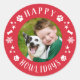 Las pegatinas navideñas presentan una foto circular de tu perro favorito con un marco festivo rojo de "Feliz Howlidays" que incluye texto moderno blanco, huellas de patas, estrellas, copos de nieve y acentos de huesos de perro. El color de fondo rojo se puede personalizar. ¡Estas pegatinas funcionan bien como sellos de sobres de tarjetas de Navidad!