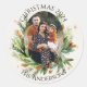 Pegatina redonda clásica de "Merry Christmas" con foto familiar de hojas verdes.