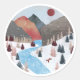 Un hermoso paisaje con texturas únicas que muestran un paisaje de río y montaña con un zorro en caza de salto medio en la nieve en tonos rojos, verdes, azules y beige.