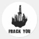 Aparatos de perforación, perforación y perforación de gas natural en forma de mano que se aleja. (volteando el pájaro). El texto dice "Frack You".