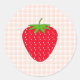 Bonito diseño de fresa rojo brillante, con una tapa verde y un fondo de rayo de gingham rosa claro.