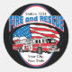 Gran bandera estadounidense de fondo frente a un gran camión de bomberos rojo con el texto azul de Fire and Rescue arriba! ¡Edite el texto y personalice este diseño de bomberos! ¡Se puede editar texto superior e inferior! ¡Añade tu nombre del departamento de bomberos, número o nombre de ciudad/ciudad! Añade el nombre de tu bombero favorito para crear el regalo perfecto para personalizados.